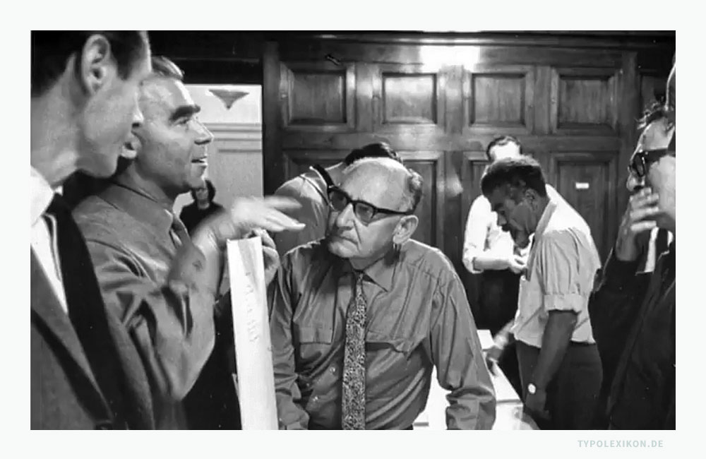 Der Typograf Max Caflisch (1916–2004) im Kreise von Kollegen auf der »Typomundus 1964«, einer internationalen Ausstellungsreihe des International Center for the Typographic Arts (ICTA). Von links nach rechts: Roger Excoffon (1910–1939), Max Caflisch, Anton Stankowski (1906–1998), Carl Dair (1912–1967), Hans Neuburg (1904–1983) und Olle Eksell (1918–2007).
