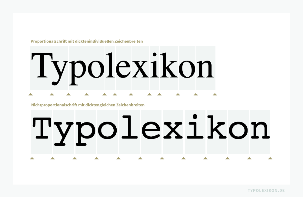 Das Pendant zu einer Nichtproportionalschrift ist eine Proportionalschrift, die auch als dicktenindividuelle Schrift, dicktenungleiche Schrift oder eng. »Proportional Typeface« bezeichnet wird.