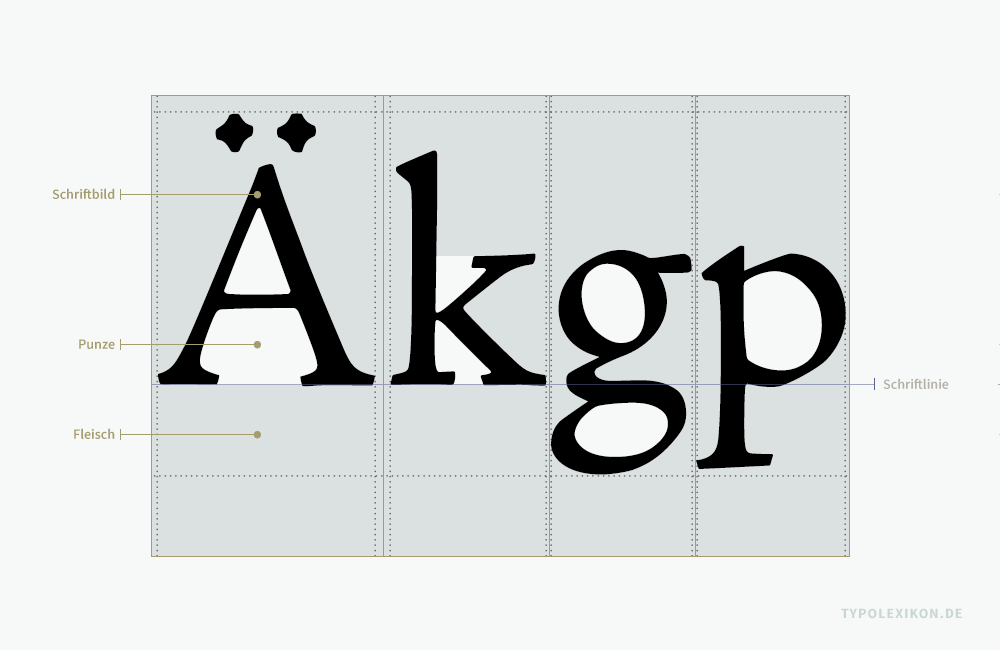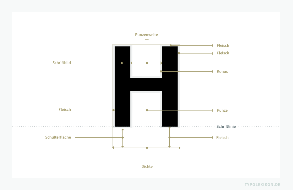 Die Bezugspunkte – also welcher nichtdruckender Außenraum zum Fleisch zählt – sind abhängig vom Satzverfahren. Bei physischen Drucktypen aus Metall (z.B. aus einer Blei-Zinn-Antimon-Kupfer-Legierung), Holz (z.B. aus Birnenholz) oder Kunststoff (z.B. aus Kunstharz) weicht die Bemaßung produktionsbedingt von optisch erzeugten Schriftzeichen (Fotosatz) und digitalen Fonts ab. Die Gesamtfläche des Fleisches bei optisch erzeugten Schriften und Fonts ist per Definition geringer als bei physischen Drucktypen.