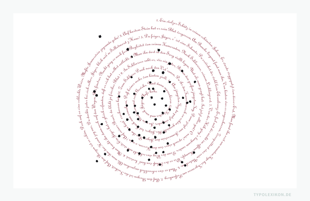 Schriftsatzart; Schriftsatz, dessen makrotypografisches Gesamtbild eine in sich geschlossene geometrische Figur oder freie Form ergibt, die auf dem Umriss einer konturierten Fläche oder einem Textpfad (Pfadtext) basiert. In der Typografie wird zwischen »Kontursatz« und »Freier Formsatz« unterschieden.