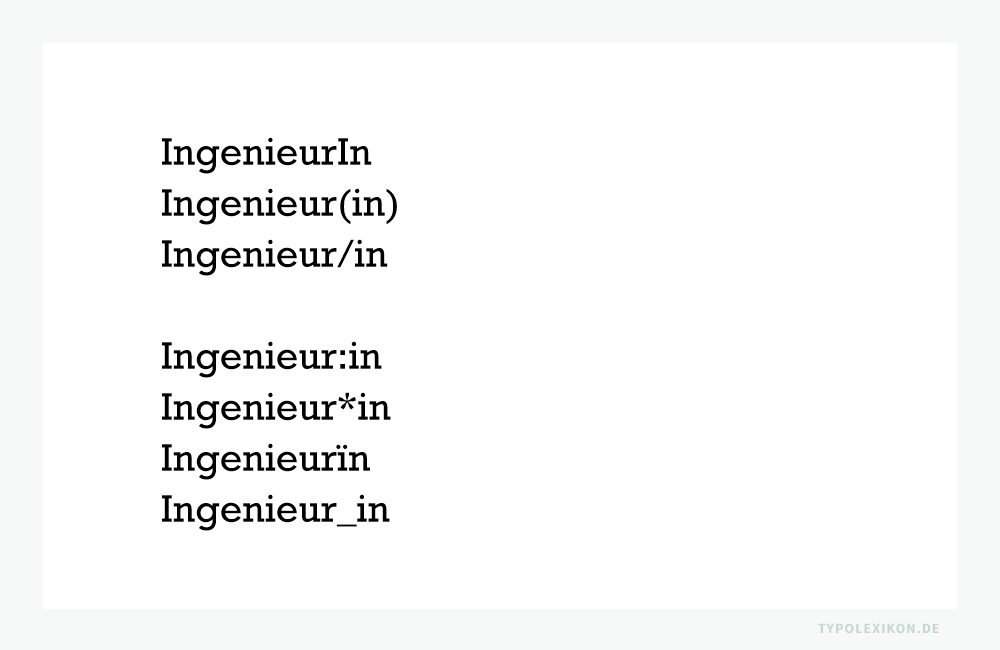 Zu den gebräuchlichsten Genderzeichen zählen beispielsweise Binnen-I (z.B. IngenieurIn), Doppelpunkt (z.B. Ingenieur:in), Parenthesen (z.B. Ingenieur[in]), Schrägstrich (z.B. Ingenieur/in), Sternchen (z.B. Ingenieur*in), Trema-ï (z.B. Ingenieurïn) und Unterstrich (z.B. Ingenieur_in).