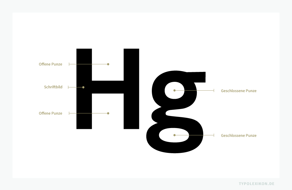 Ein in sich geschlossener Buchstabenbinnenraum, z.B. bei der Majuskel »Q«, wird als geschlossene Punze, ein geöffneter Buchstabeninnenraum, z.B. bei der Minuskel »v«, als offene Punze bezeichnet. Punzen zählen wie das Fleisch zu den nichtdruckenden Teilen eines Schriftbildes.