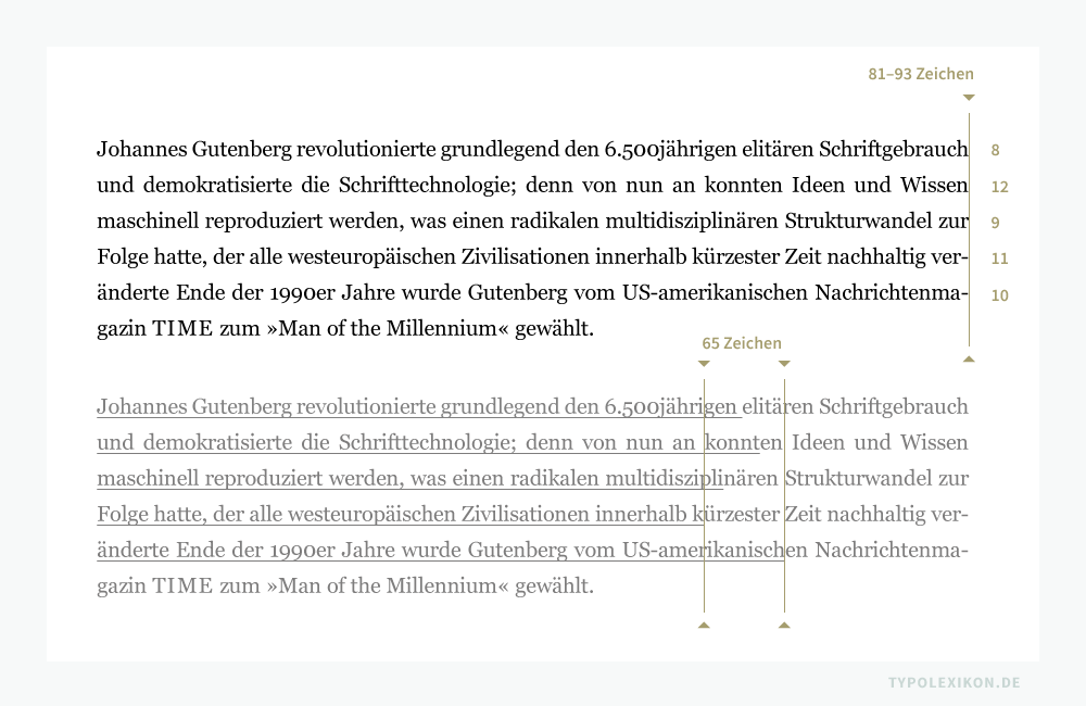 Diese Zielvorgabe kommt erfahrungsgemäß einem bequemen und schnellen Lesen (siehe u.a. Fixationen) der deutschen Sprache sehr entgegen und bietet darüber hinaus dem Schriftsetzer:in auch genügend Möglichkeiten, den »Ausschluss« eines Blocksatzes zu optimieren, also gleichmäßige Wortzwischenräume zu erzielen (siehe Wortzwischenraum. 6) 7) 8)