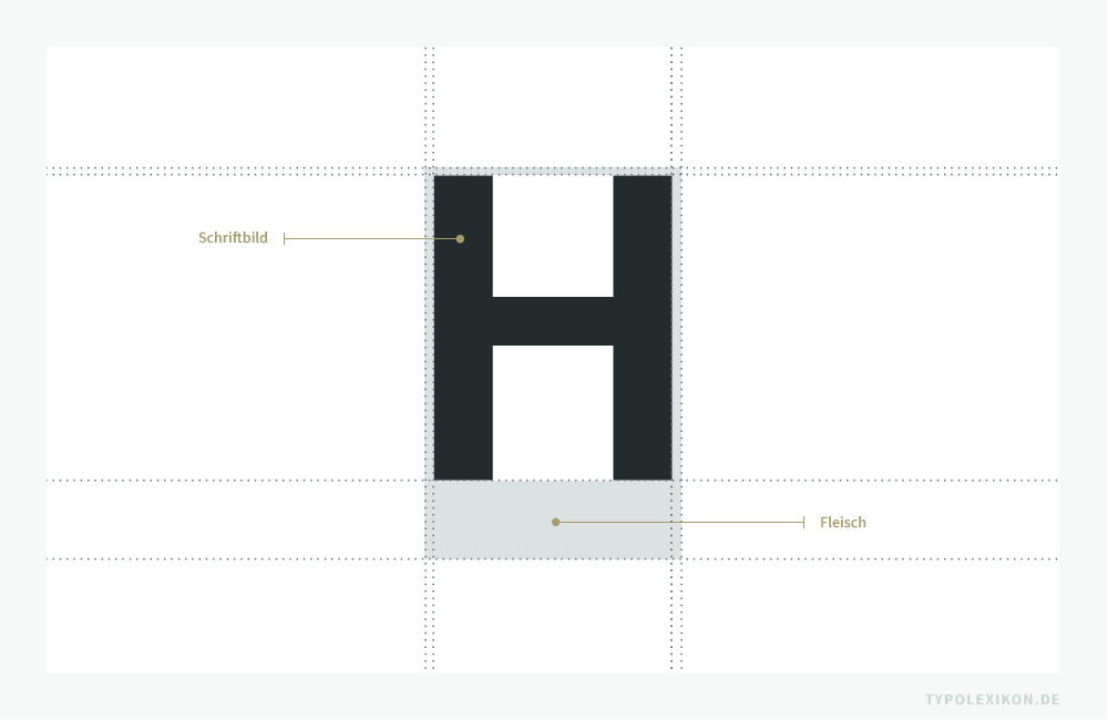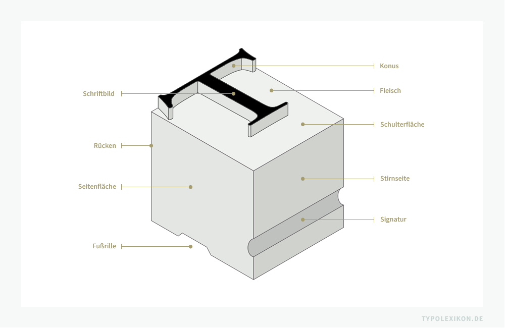 Der Kopf trägt das erhabene, spiegelverkehrt druckende Zeichen (z.B. Buchstabe, Arabische Ziffer oder Sonderzeichen) und wird als »Schriftbild« bezeichnet, welches vom nichterhabenen, nichtdruckenden Fleisch sowie von den Punzen umgeben bzw. perforiert ist. 1) Die Höhe des Körpers wird »Schulterhöhe« genannt. Der Fuß als solches ist nur eine Kennzeichnung und besitzt keine physikalische Höhe.