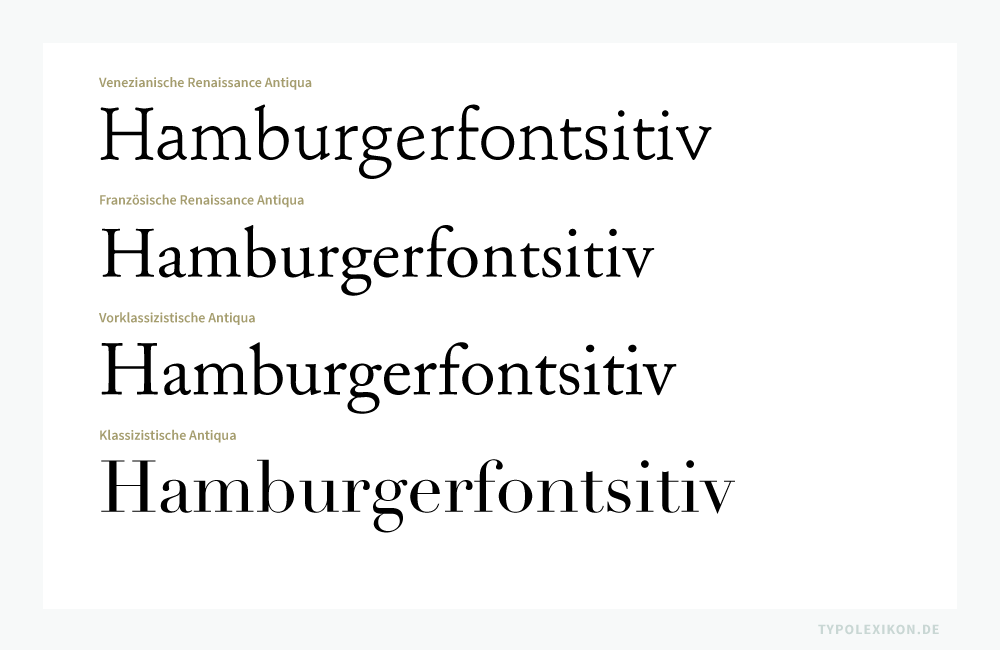 | ↑3 | Anmerkung: Philologische Schriftklassifikationen ordnen Antiquas auch nach anderen Anforderungen und Kriterien, beispielsweise nach sprachlicher Herkunft, Schreibrichtung, Stilepochen und Geographie. |