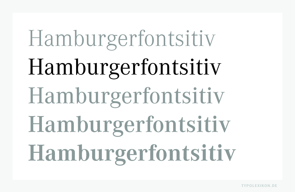 Gut »ausgebaute« Schriftfamilien (und Schriftgarnituren) bieten – ausgehend von der Basisschriftstärke des normalen Schriftschnitts (regular) – zusätzliche Abstufungen in den Schriftstärken von »ultra leicht« bis »ultra fett«.