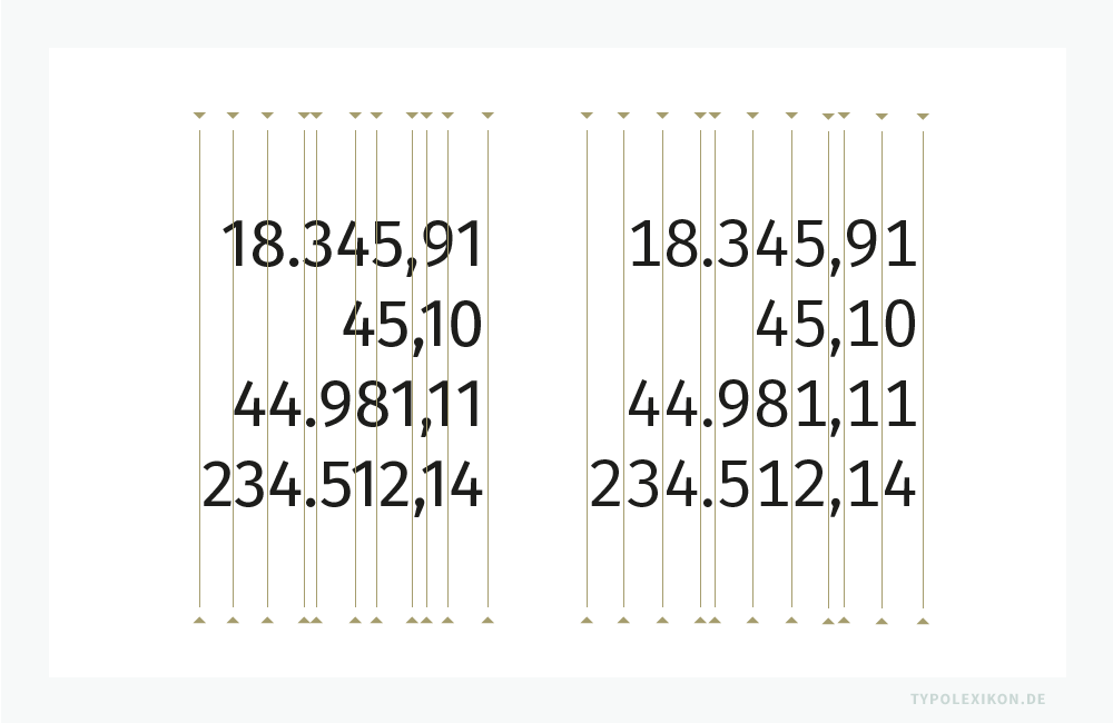 Tabellenziffern verfügen über eine exakt gleiche Dickte, also über eine systematisch gleiche Zeichenbreite resp. Zeichenabstand, inklusive der Vor- und Nachbreiten bzw. des Fleisches.