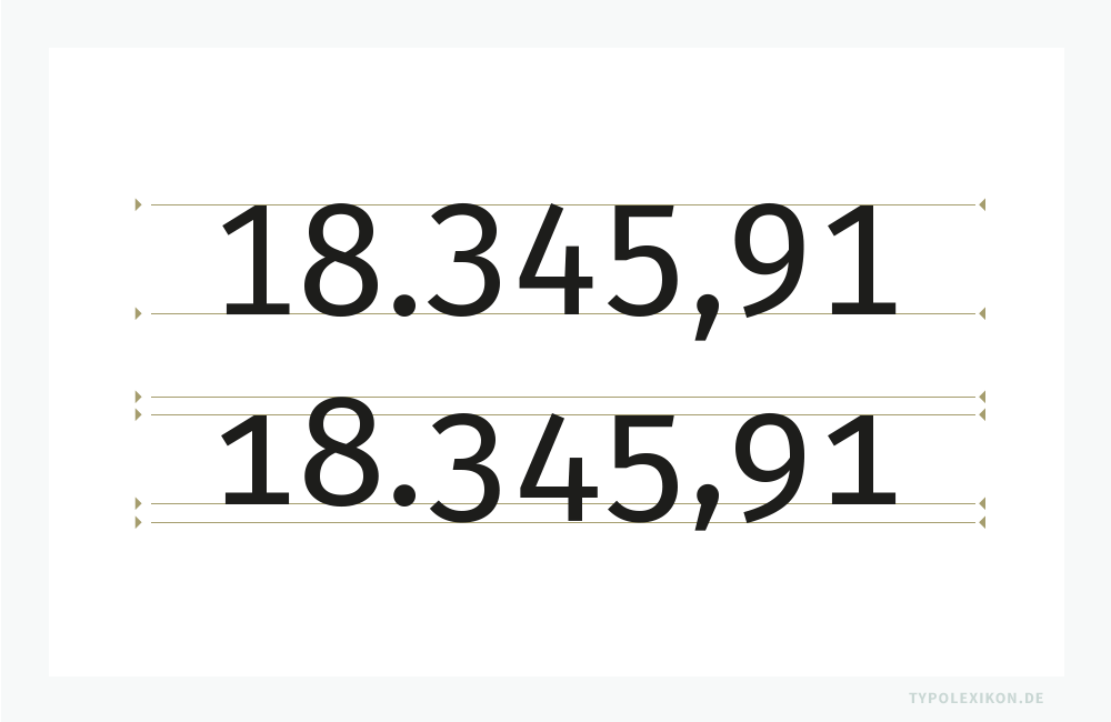| ↑5 | Tipp: Schriftgestalter und Font Foundries passen die Dickten proportionaler Ziffern von Corporate Fonts (CD- und Unternehmensschriften) an. Von ästhetischen Aspekten abgesehen, amortisiert sich diese Dienstleistung sehr schnell, beispielsweise beim Schriftsatz von Geschäftsberichten, wissenschaftlicher Literatur oder Katalogen. |