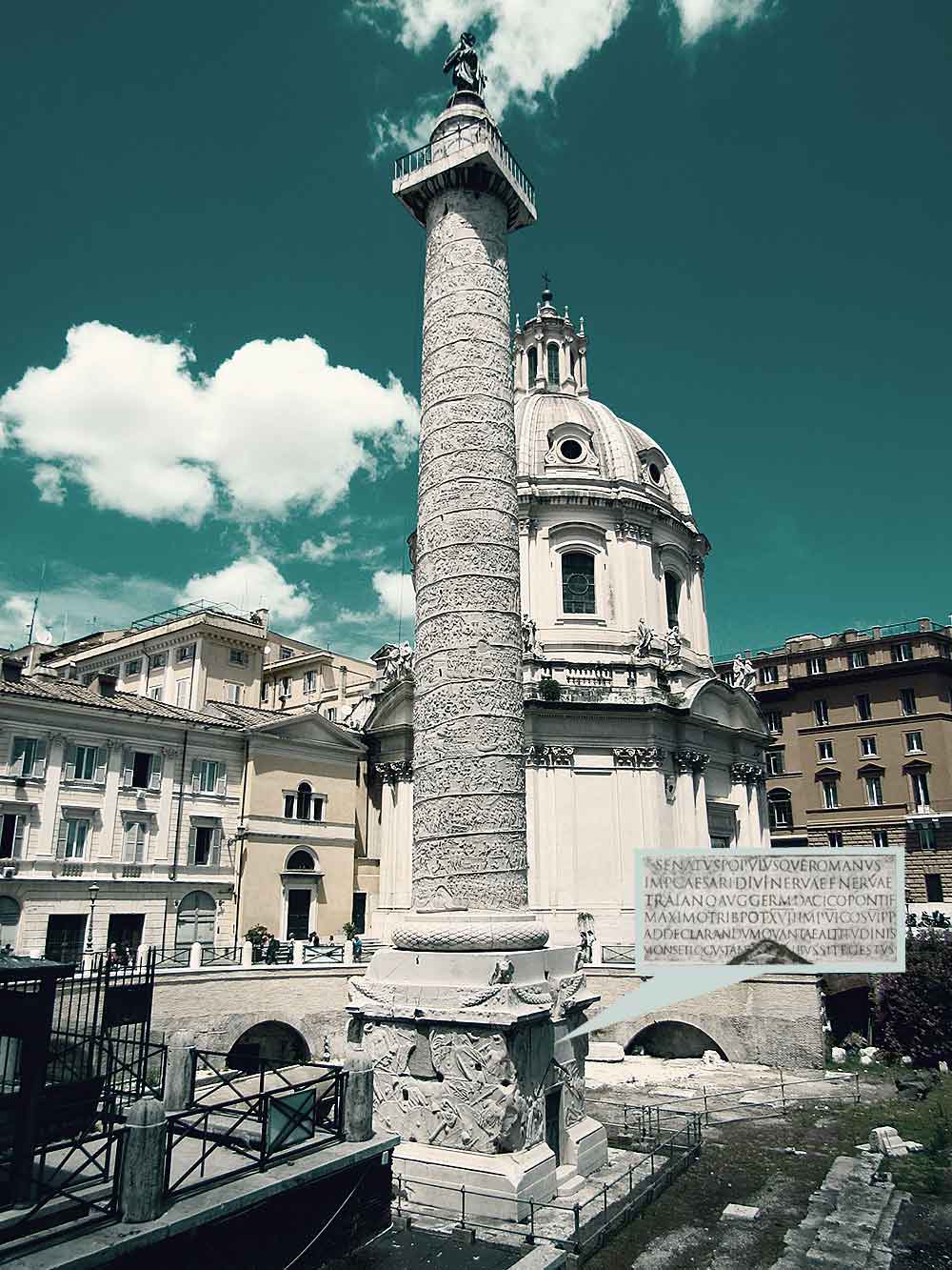 Die Trajanssäule erinnert u.a. an die Entstehungsgeschichte der Trajansmärkte, an deren Stelle extra ein Berg abgetragen werden musste. Die Stele selbst schmückt eine spiralförmige Reliefdarstellung mit einer Länge von rund 200 Metern, welche zwei Feldzüge Trajans gegen die Daker darstellt. Seit 1588 krönt die Säule anstatt der Kaiserstatue eine Petrusstatue.