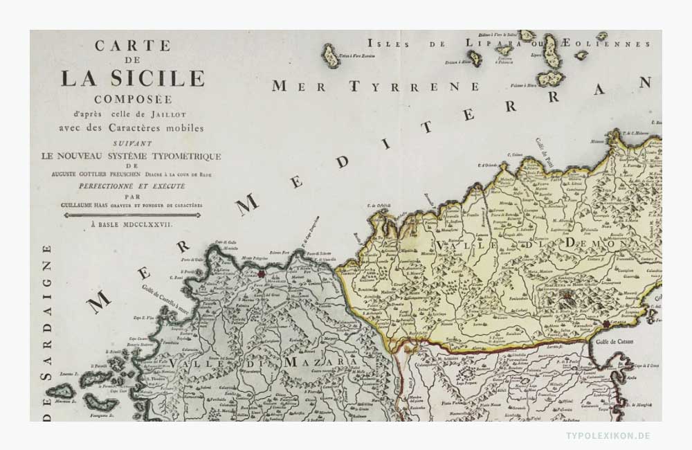Im 18. Jahrhundert wurde der Begriff »Typometrie« mutmaßlich vom deutschen Theologen, Kartographen und Geologen August Gottlieb Preuschen (1734–1803) kurzweilig für ein drucktechnisches Verfahren verwendet, um großformatige Landkarten und Pläne mit beweglichen Typen – also Landkarten ähnlich wie Bücher – herzustellen. 3)