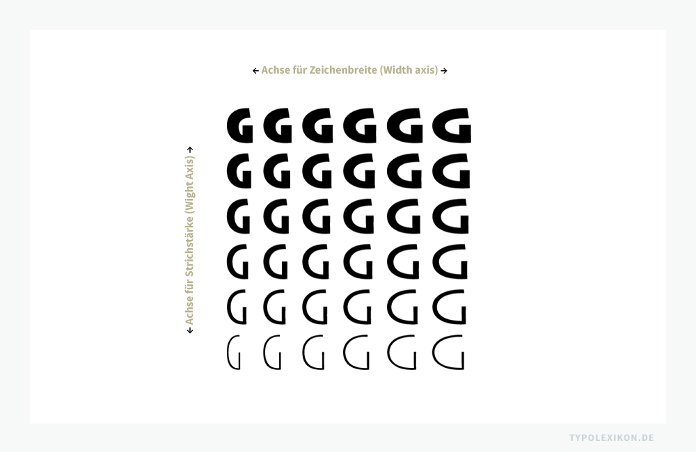 Ein »Variable Font« besteht aus einem Font File (Schriftdatei), mit dem in einem OS Operating System (z.B. Apple macOS®) bzw. in einer Application Software (z.B. Google Chrome® oder Microsoft Word®) unterschiedliche Strichstärken, Schriftbreiten und Schriftlagen – basierend auf variablen Interpolationsachsen, Variations- und Stilattributtabellen – interpoliert und generiert werden können.