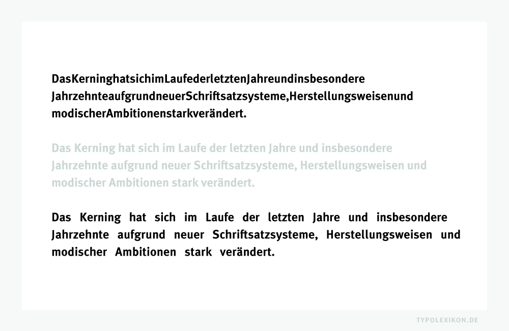 Sowohl das Zeichenabstands– als auch das Wortabstandskerning hat sich im Laufe der letzten Jahre und insbesondere Jahrzehnte aufgrund neuer Schriftsatzsysteme, Herstellungsweisen und modischer Ambitionen stark verändert. Das relative Kerning unterscheiden sich deshalb je nach Schrift, Schriftsatzsystem, Schriftgestalter:in, Type Foundry und Erscheinungsjahr. 3)